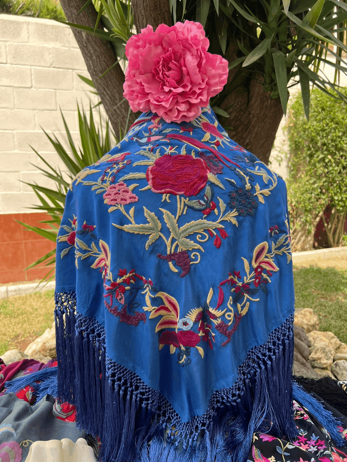 Todos mis mantones son de seda, bordados a máquina y flecados a mano.