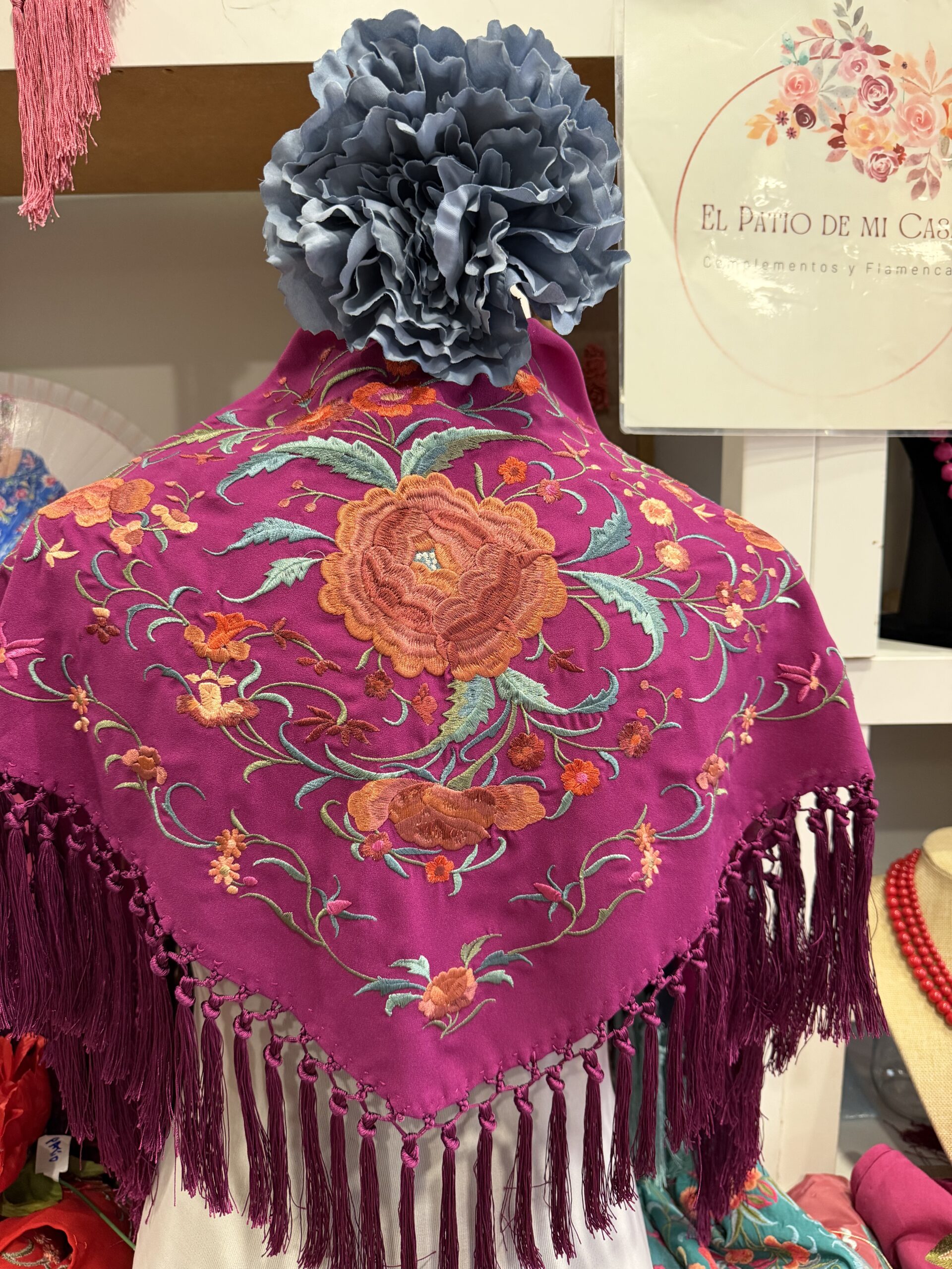 Todos mis mantones son de seda, bordados a máquina y flecados a mano.