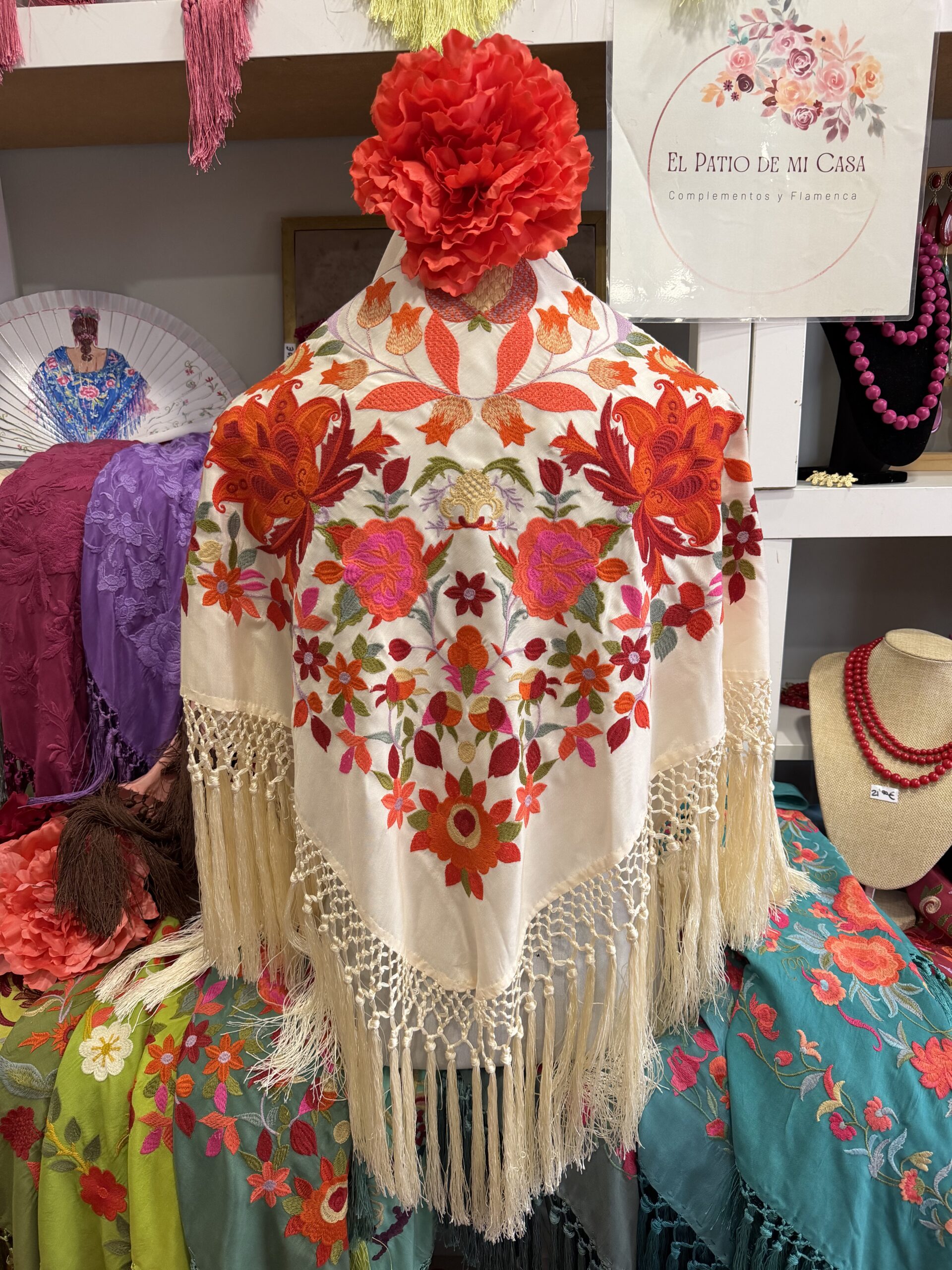 Todos mis mantones son de seda, bordados a máquina y flecados a mano.