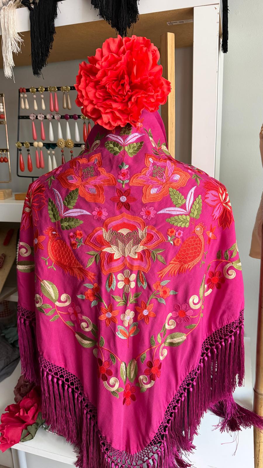 Todos mis mantones son de seda, bordados a máquina y flecados a mano.