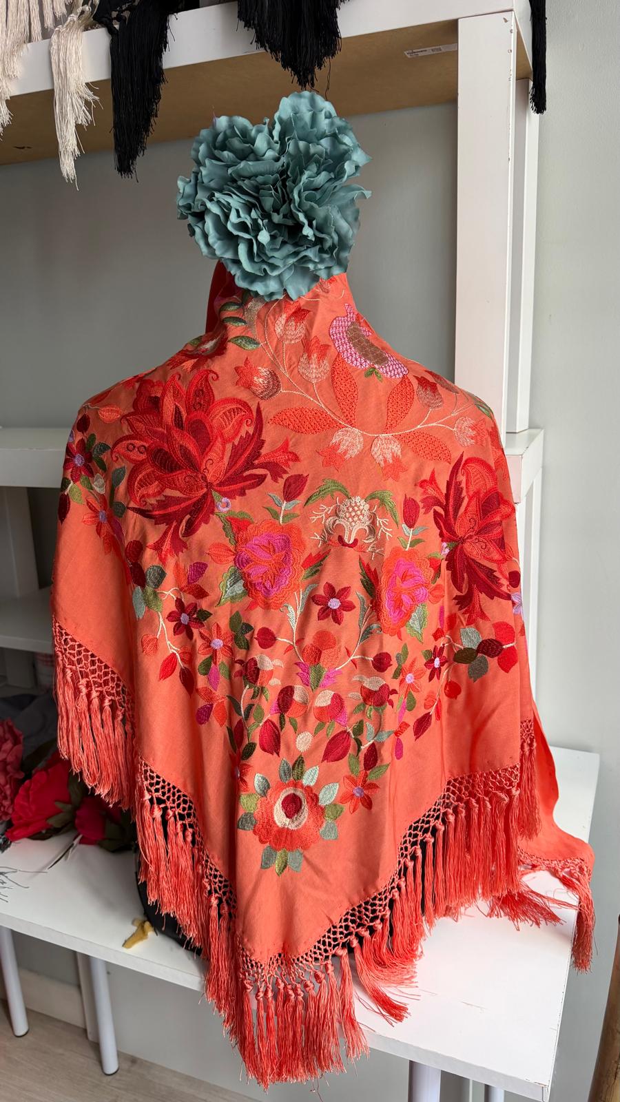 mantoncillo de seda, mandarina, con fleco especial de borlónmantoncillo de seda, mandarina, con fleco especial de borlón