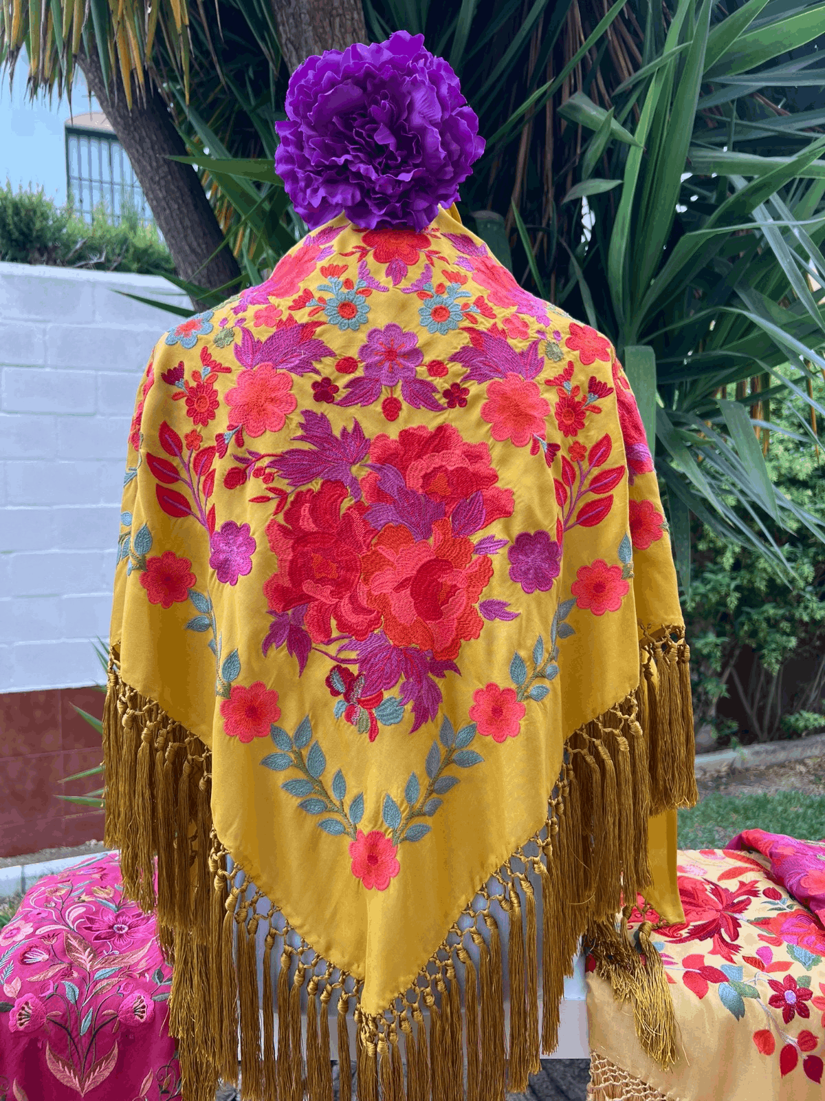 Todos mis mantones son de seda, bordados a máquina y flecados a mano.