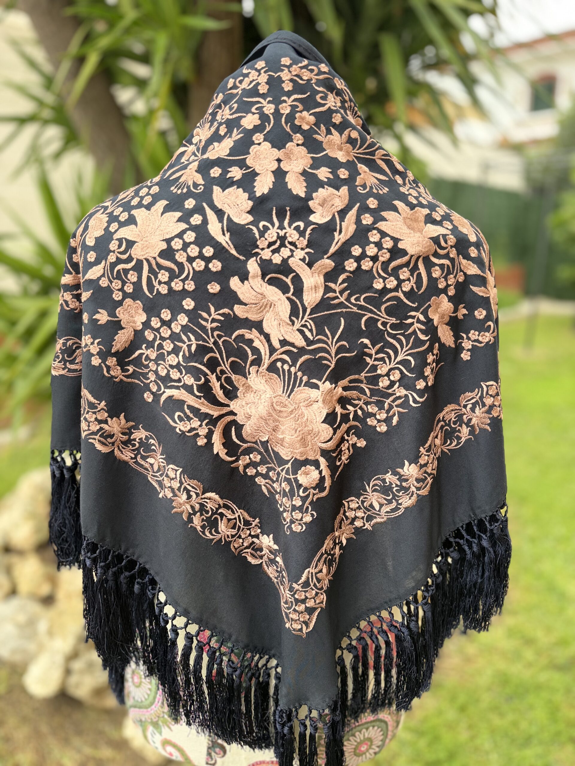Mantoncillo de seda negro bordado en bronce, con fleco de borlón
