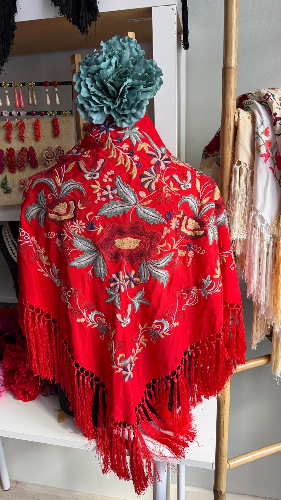 Todos mis mantones son de seda, bordados a máquina y flecados a mano.