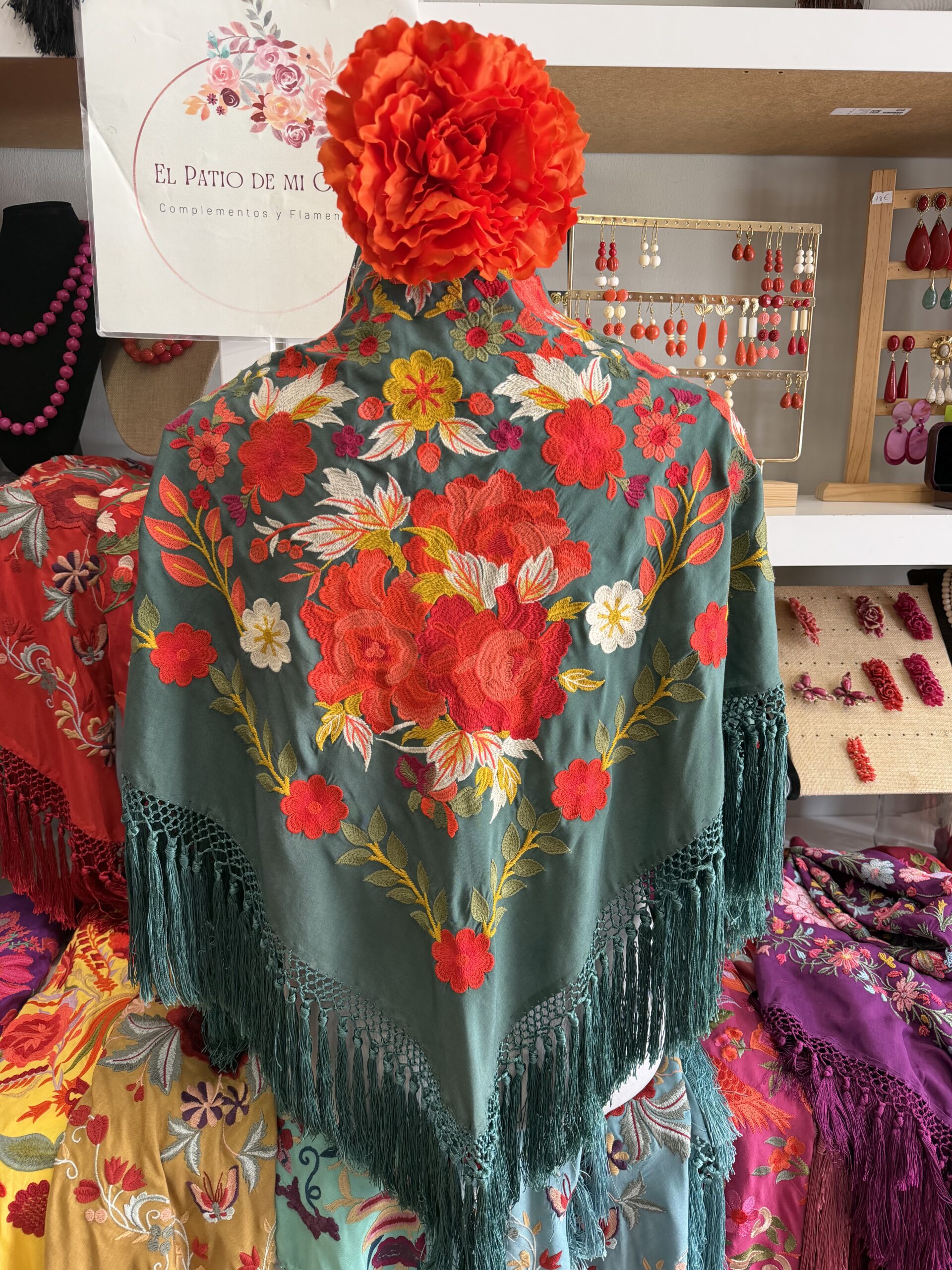 Todos mis mantones son de seda, bordados a máquina y flecados a mano.