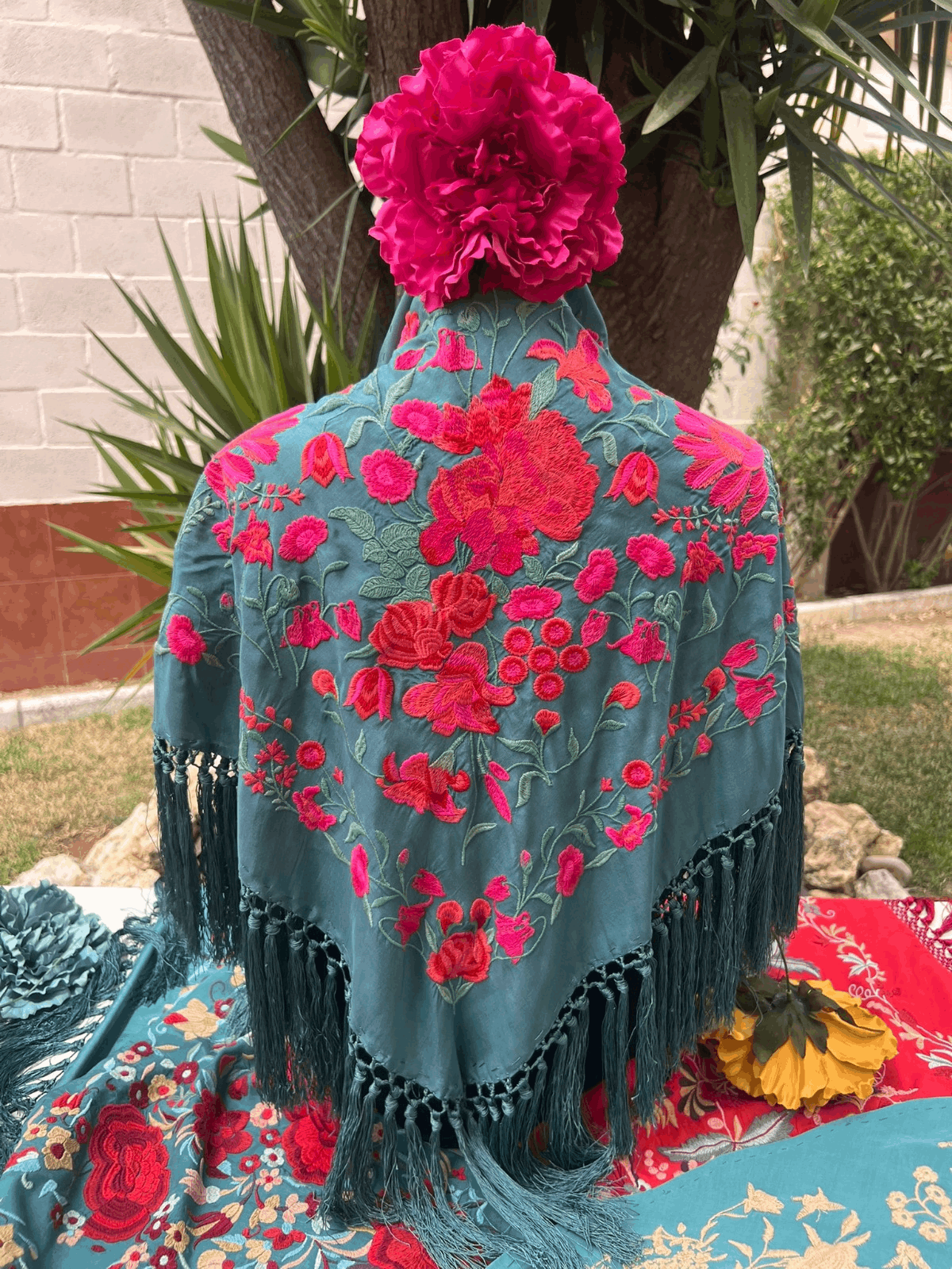 Todos mis mantones son de seda, bordados a máquina y flecados a mano.
