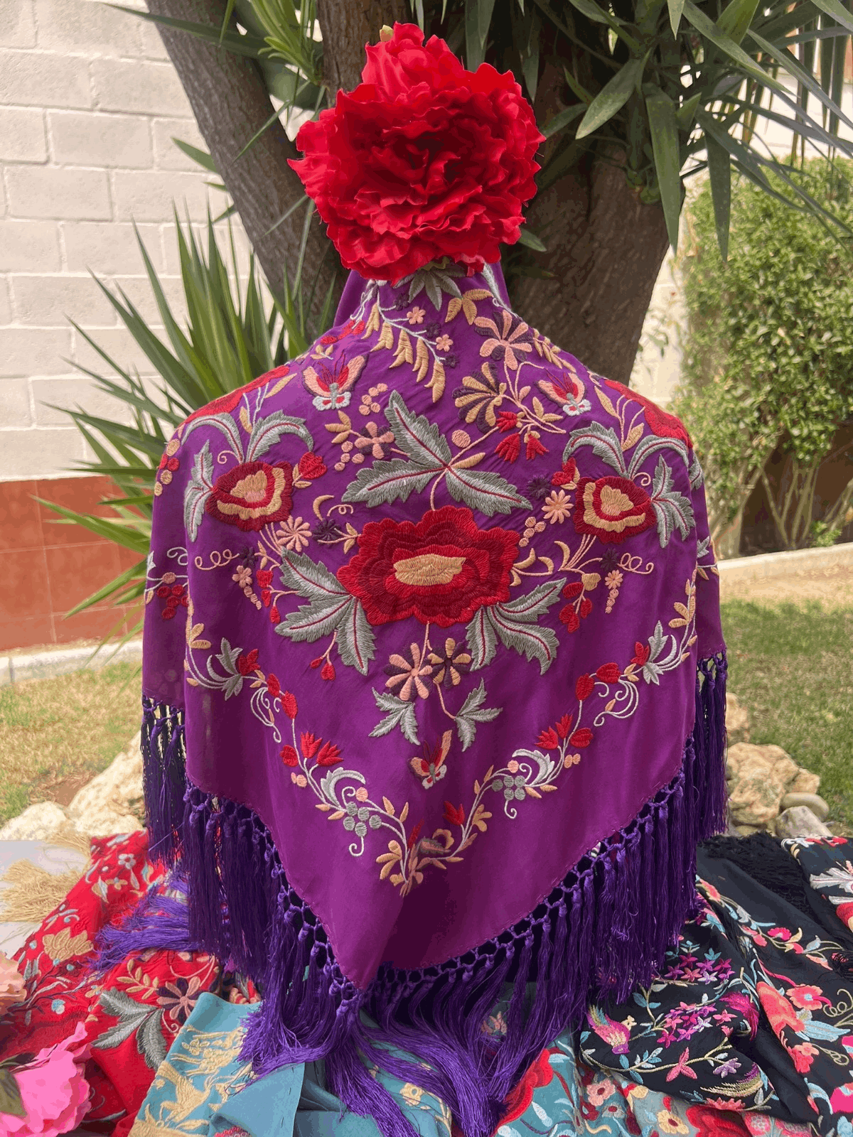 Todos mis mantones son de seda, bordados a máquina y flecados a mano.