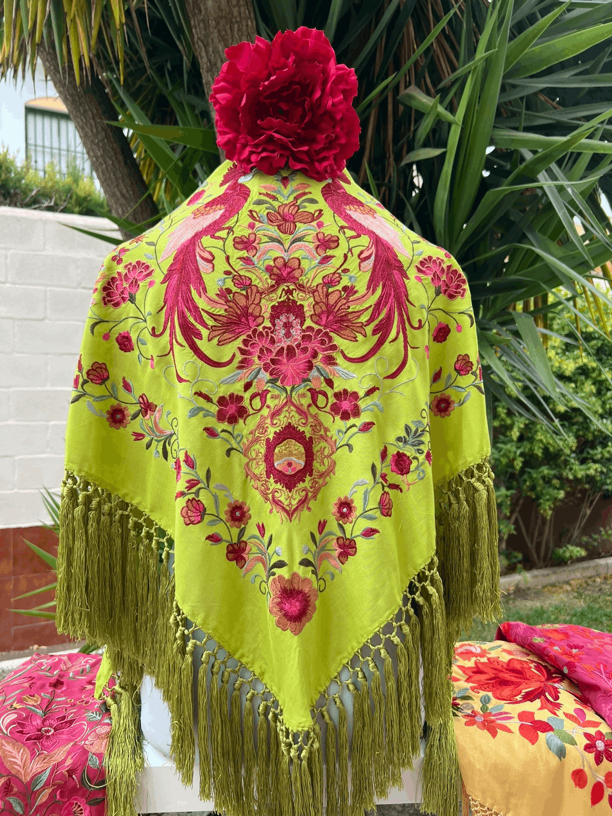 Todos mis mantones son de seda, bordados a máquina y flecados a mano.