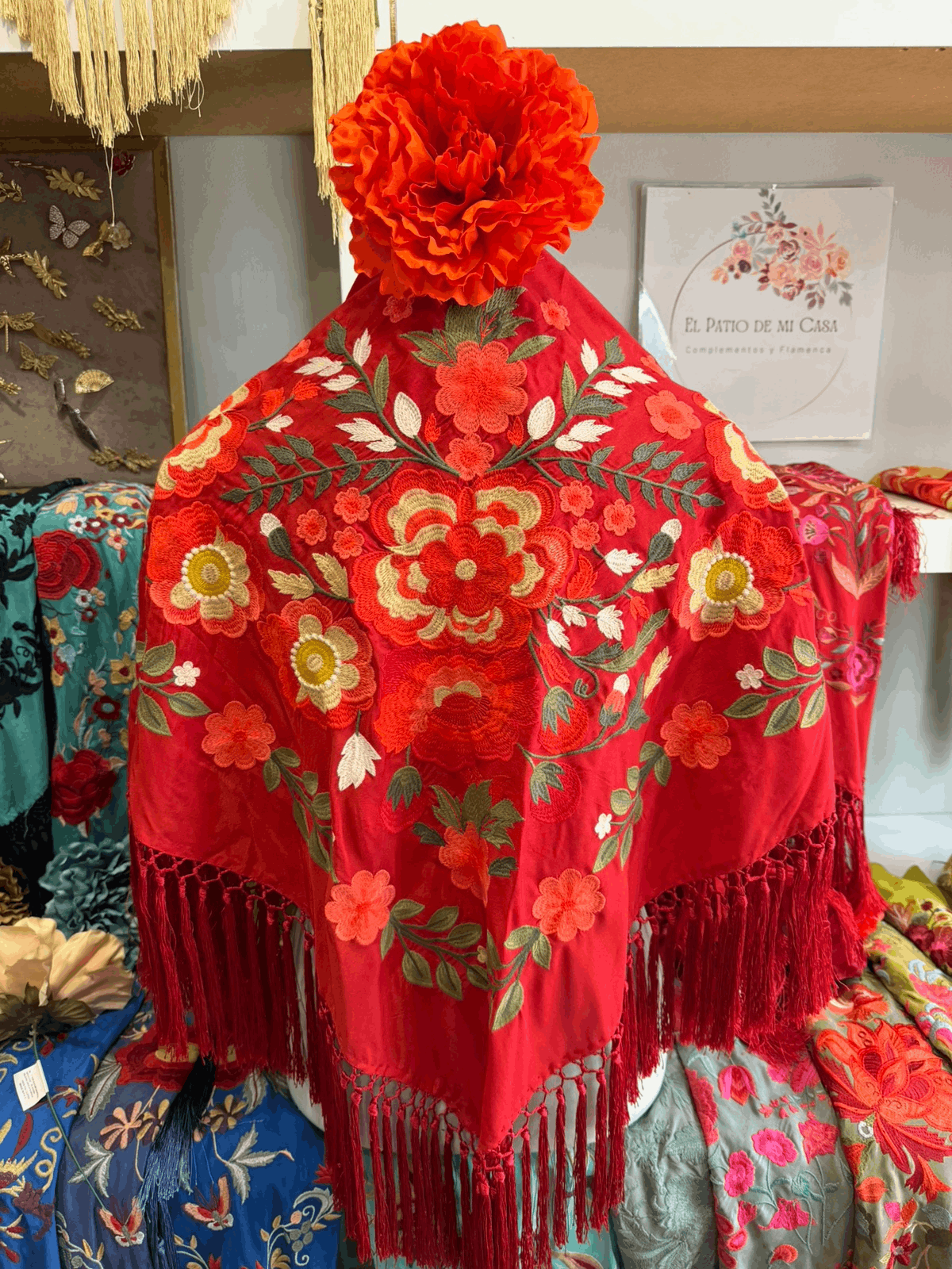 Todos mis mantones son de seda, bordados a máquina y flecados a mano.