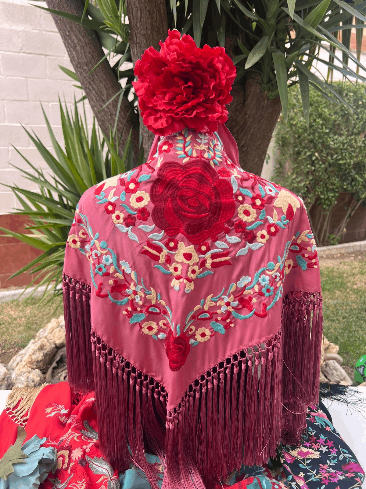 Todos mis mantones son de seda, bordados a máquina y flecados a mano.