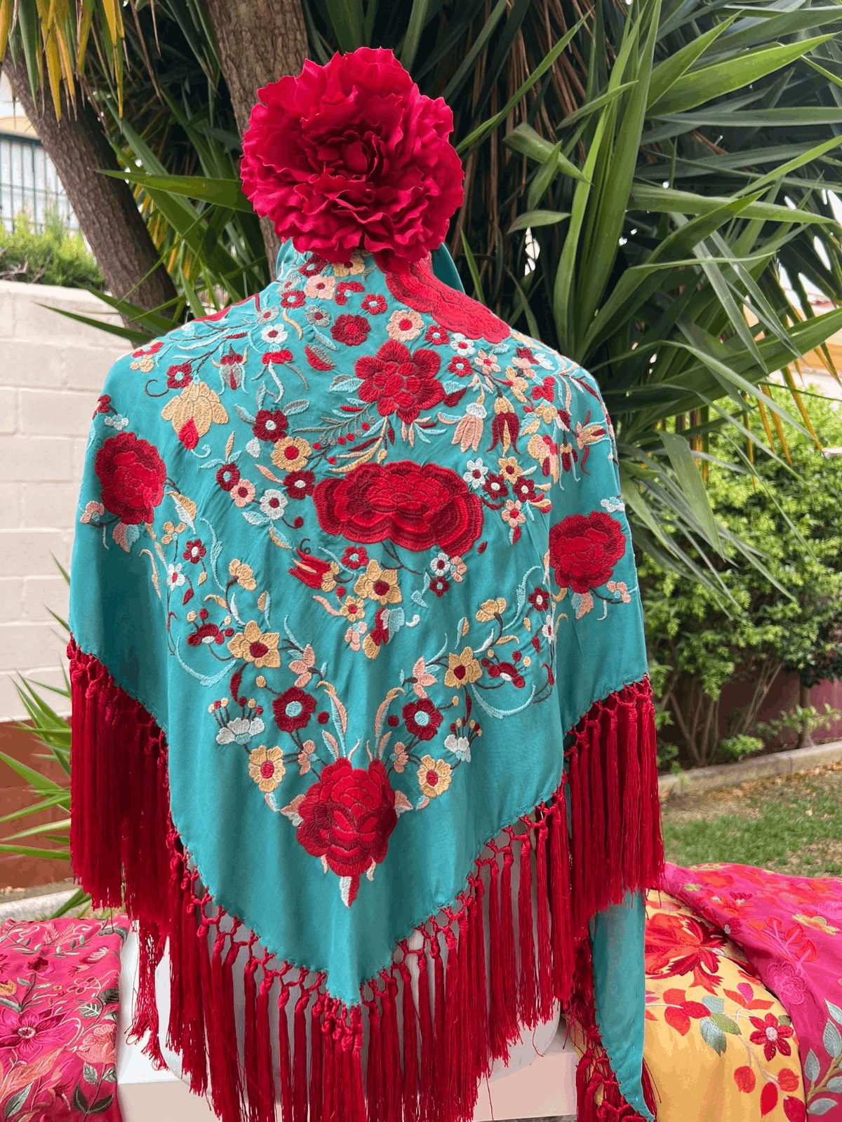 Todos mis mantones son de seda, bordados a máquina y flecados a mano.