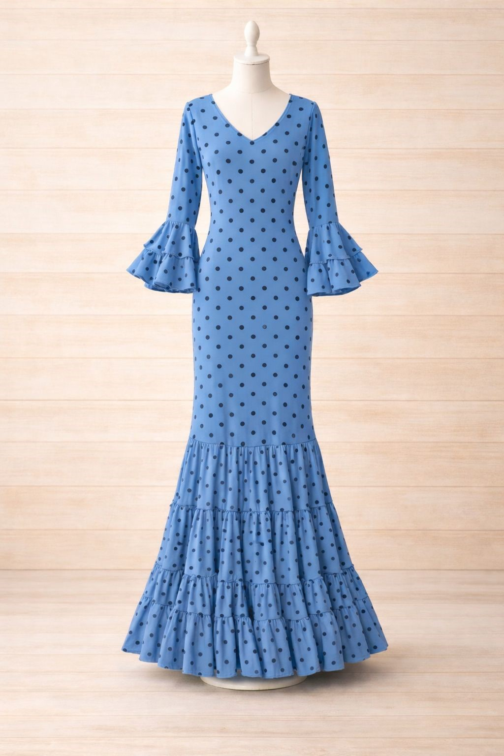 Traje de flamenca, canastero, celeste lunar azul, elaborado en Sevilla, confeccionado en Strech