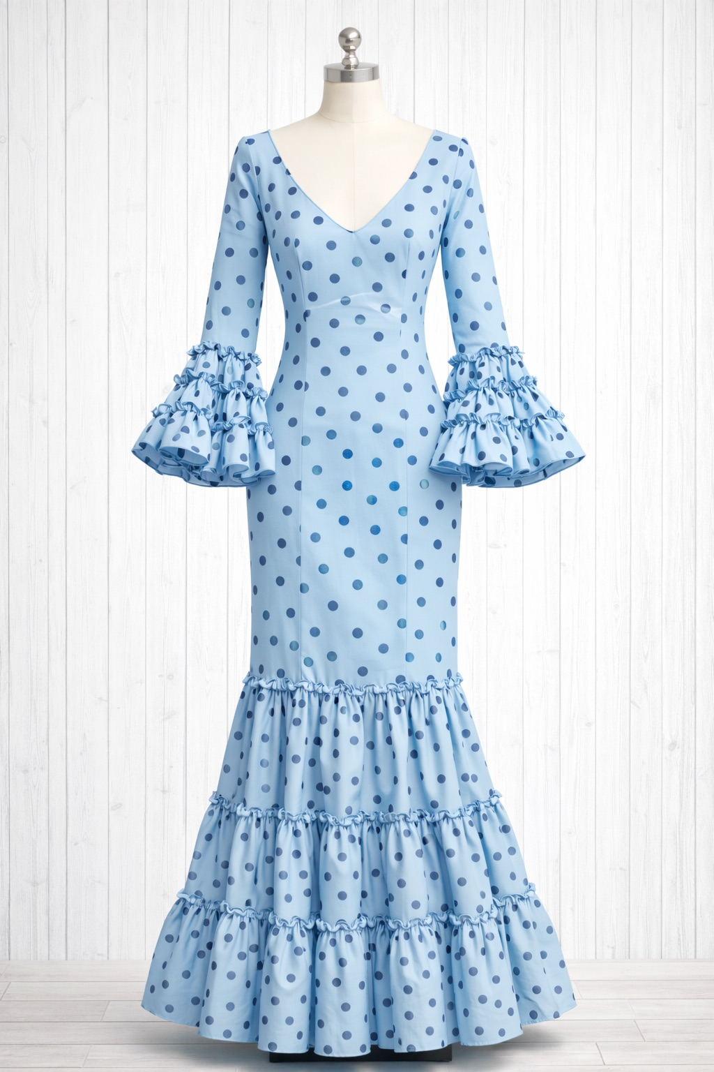 Traje de flamenca canastero celeste lunar azul, elaborado en Sevilla, confeccionado en Strech