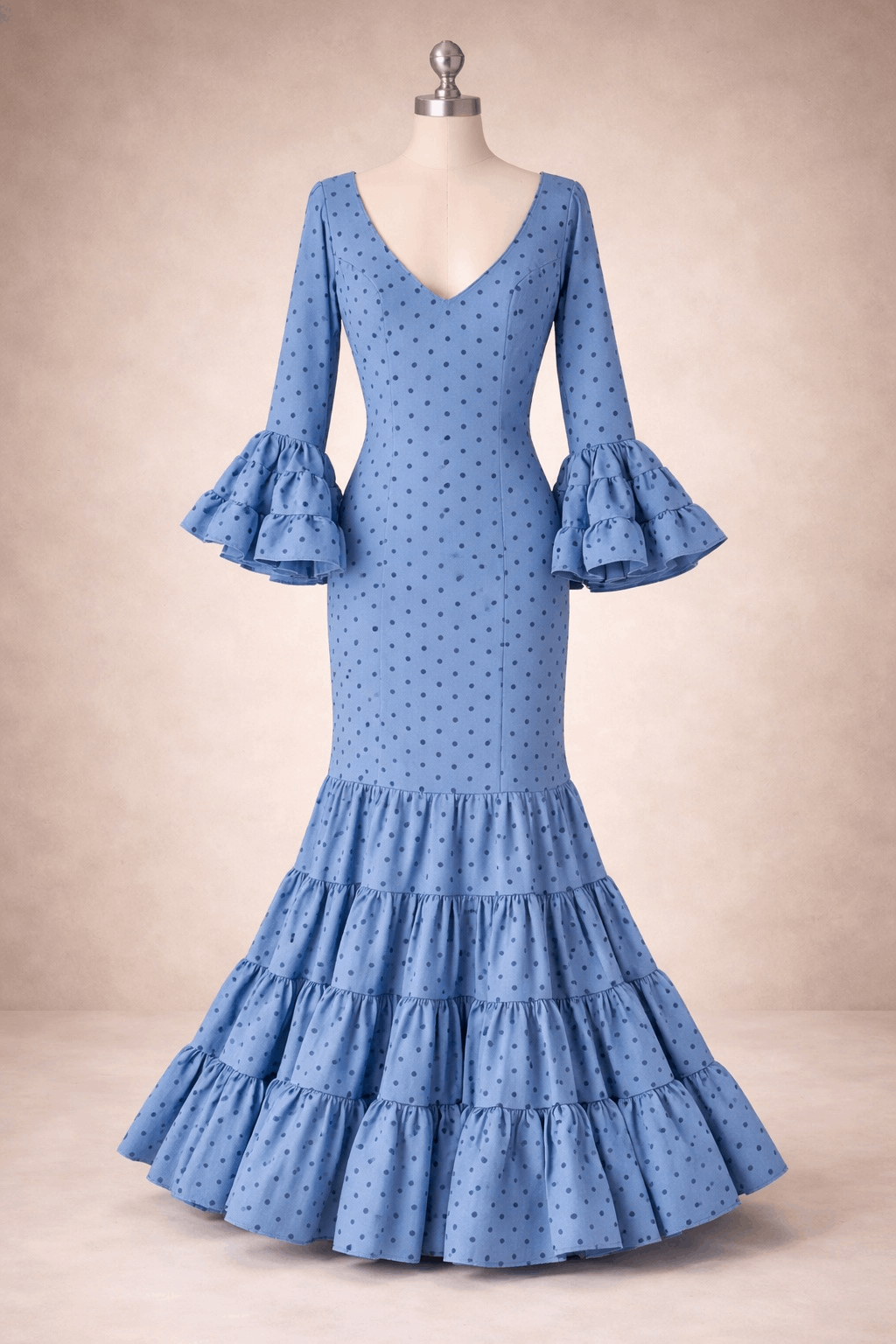 Traje de flamenca canastero con cancán, elaborado en Sevilla, confeccionado en Strech