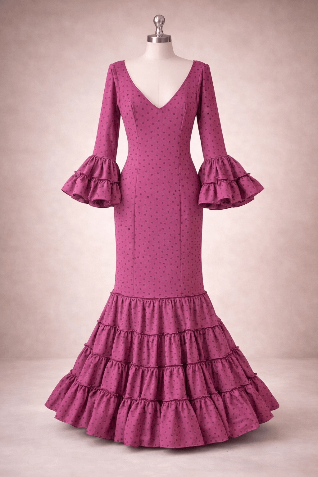 Traje de flamenca canastero con cancán y adornos en terciopelo, elaborado en Sevilla, confeccionado en Strech