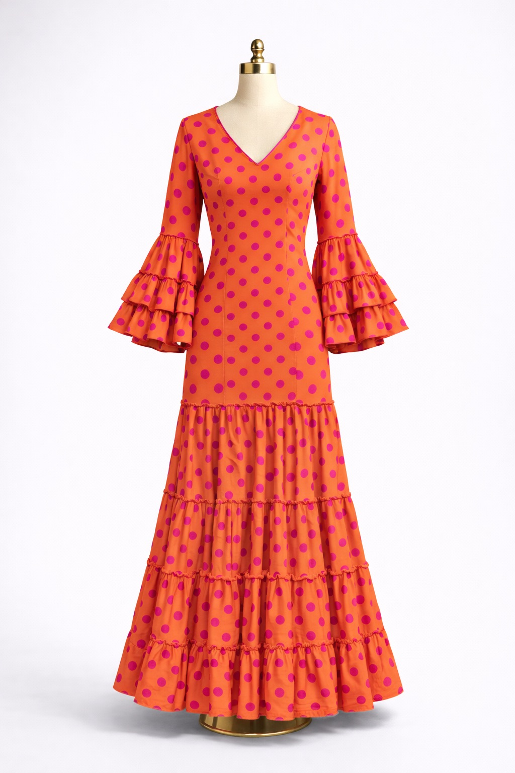 Traje de flamenca canastero naranja con lunar buganvilla, elaborado en Sevilla, confeccionado en Strech