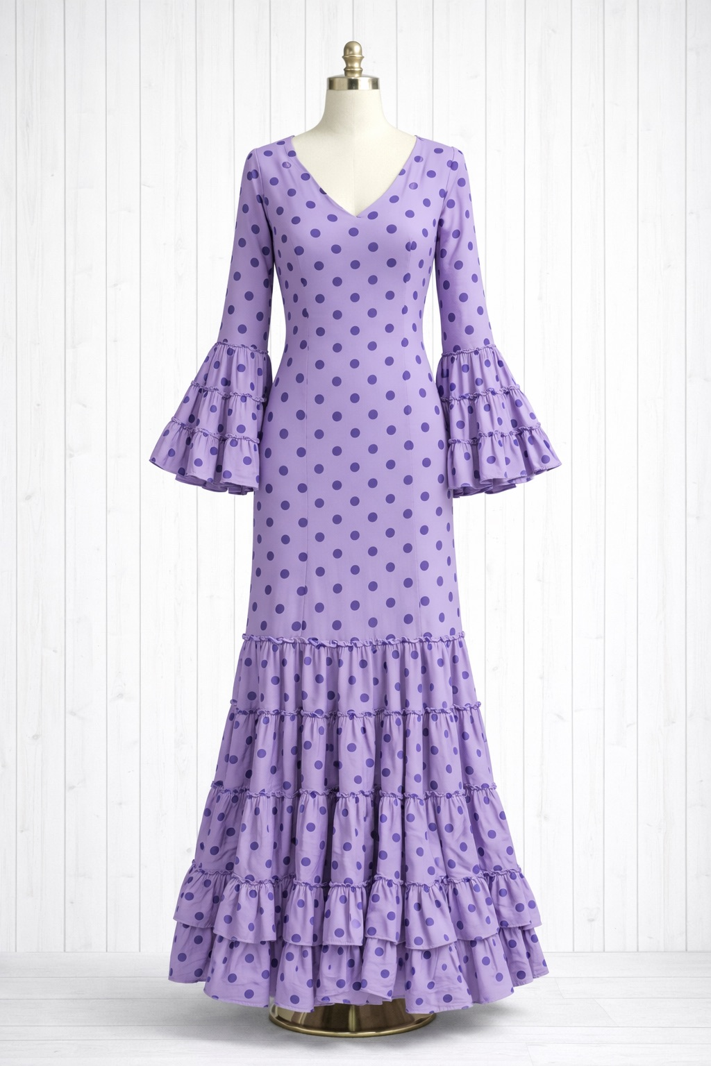 Traje de flamenca malva con lunar morado, elaborado en Sevilla, confeccionado en Strech