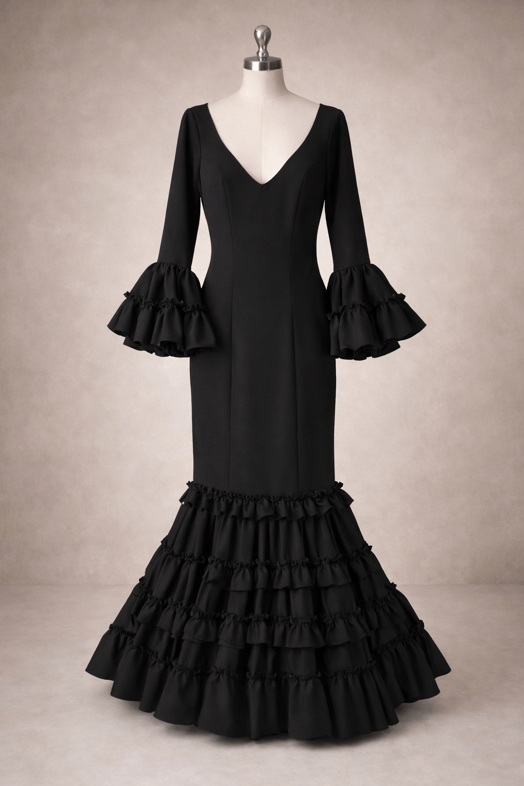 Traje de flamenca negro canastero, elaborado en Sevilla, confeccionado en Strech